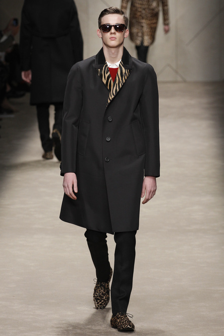 I heart Classics! was the name of Mr Bailey's foray into mens this season, after a metallic fun-fest for S/S 13 fall seemed on the surface to be a much more staid affair. Alas! Look deeper into it and the theme of the day was clearly classics with a twist... Outerwear sculpted in oxblood leather, ponyskin and a flash of zebra slinked down the runway. Duffel coats with toggles made of whip thin leather, and cable knits sitting cropped at the hip... Ohhh and the latex, with the heart prints flashing through to smbolise Monsieur bailey's LOVE theme. If the brand has had a bumpy ride pf late, it proved with this collection alone that one thing they do (and always have) outstandingly is classics. And loving them can't be a bad thing either.